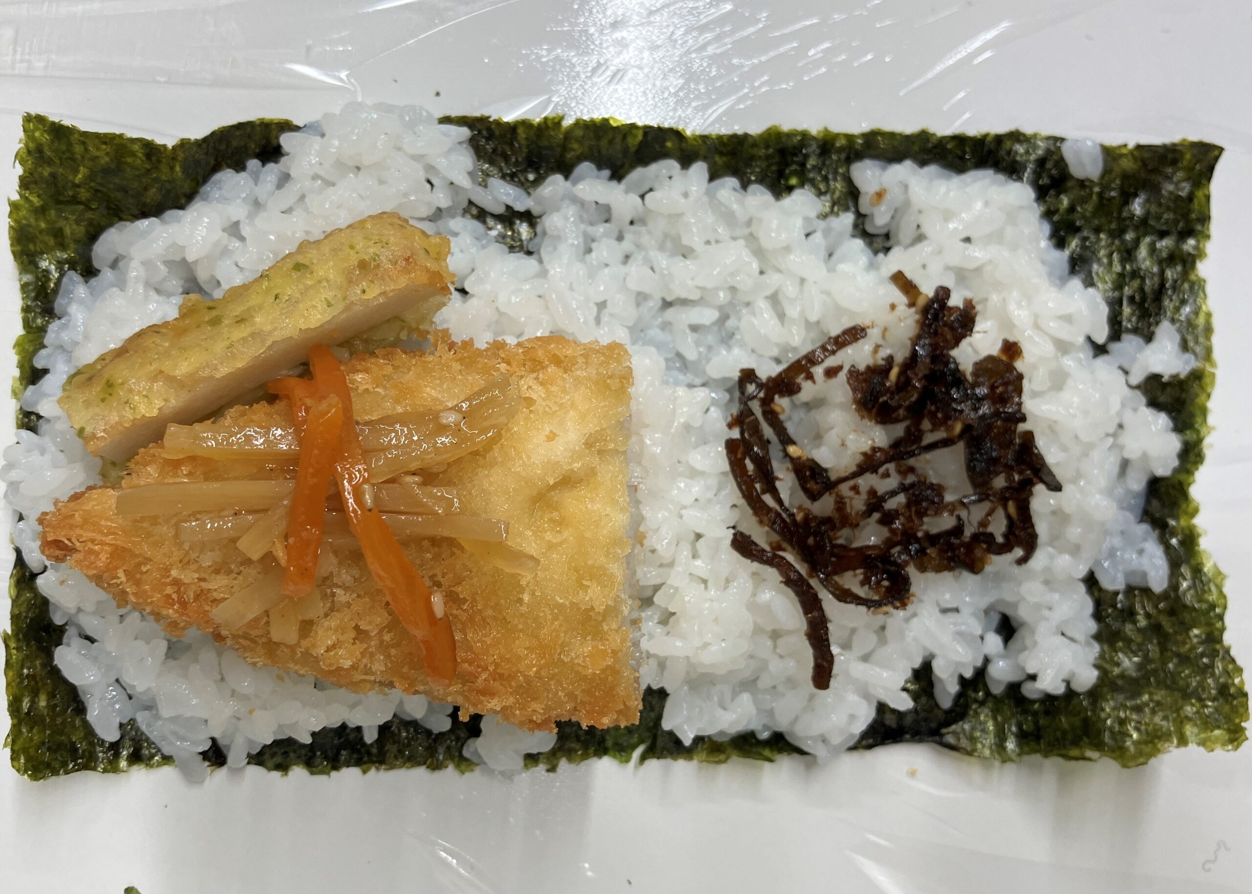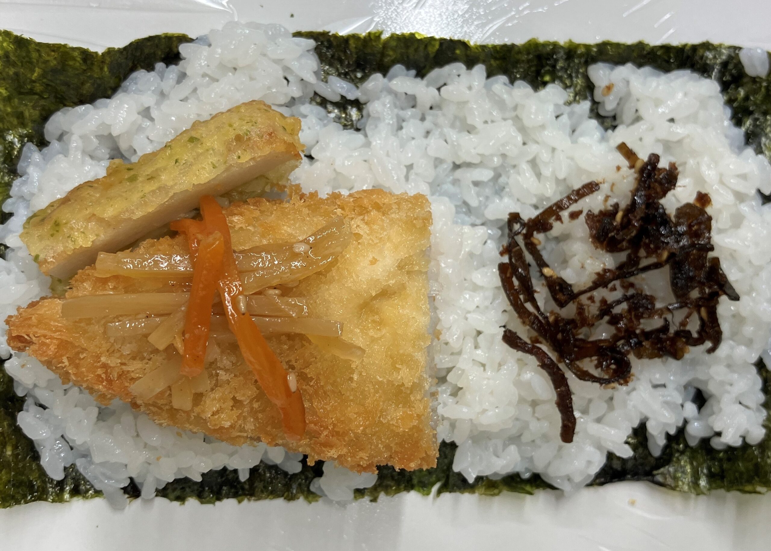 のり弁で定番の白身フライ、ちくわの磯辺天、おかか昆布、きんぴらごぼうをおにぎりサンドにしました。